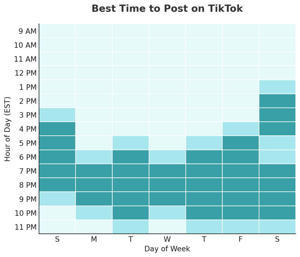 Evening hours typically perform best on TikTok, with peak engagement on TikTok occurring between 6-10 PM local time.